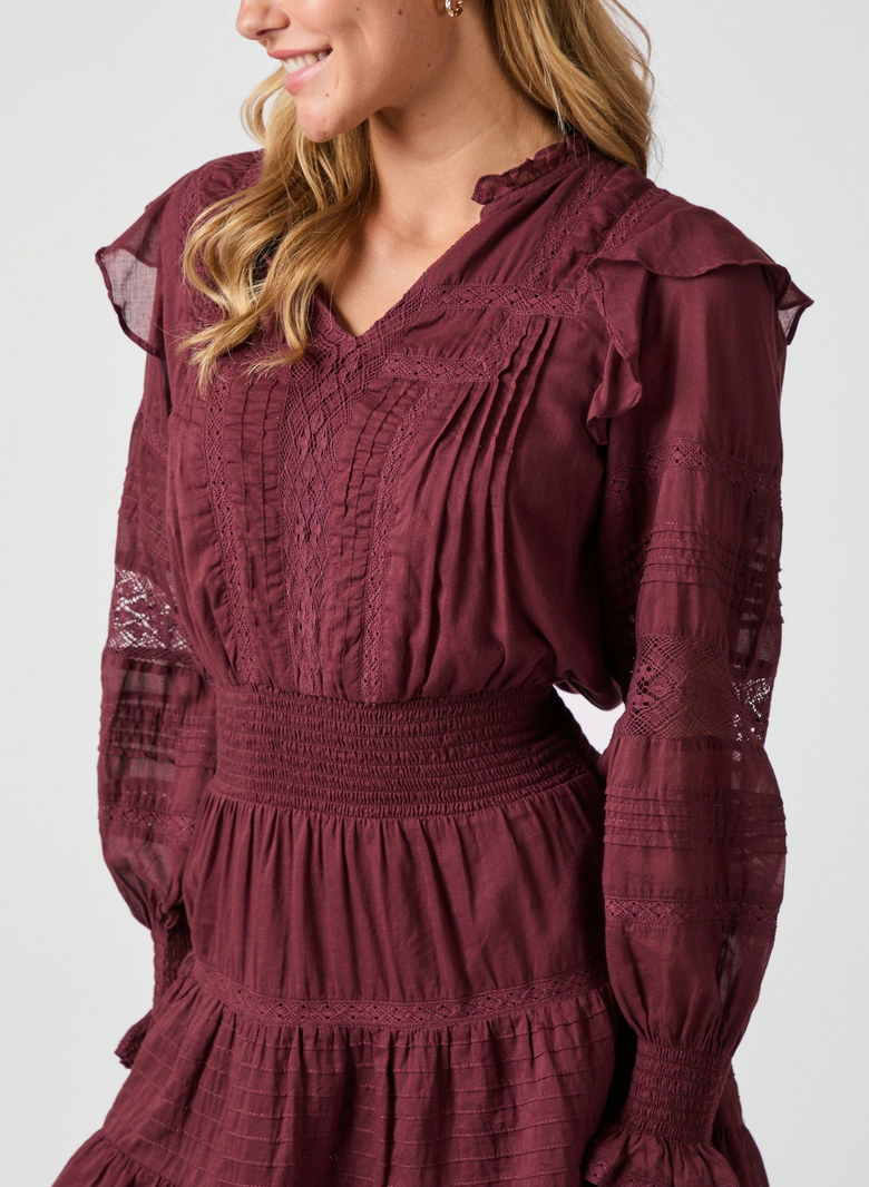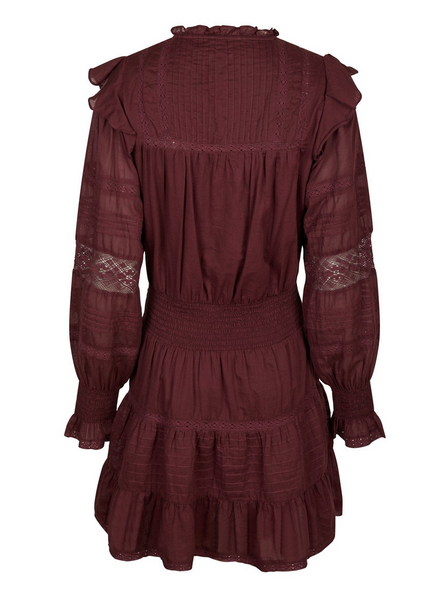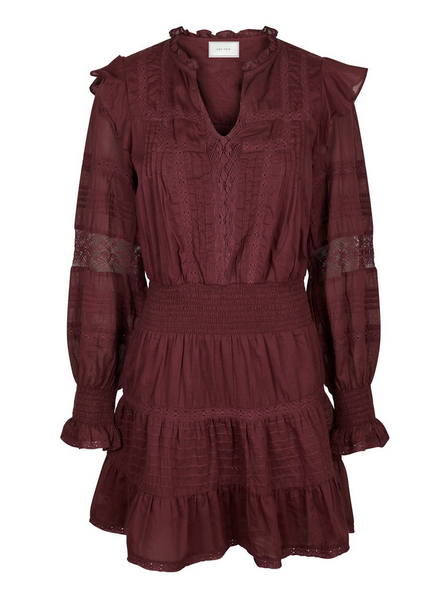 Aran kjolen fra Neo Noir er en smuk bomuldskjole med smock i taljen for et mere feminin look. Kjolen har mange fine flæsedetaljer og en lille v-hals.