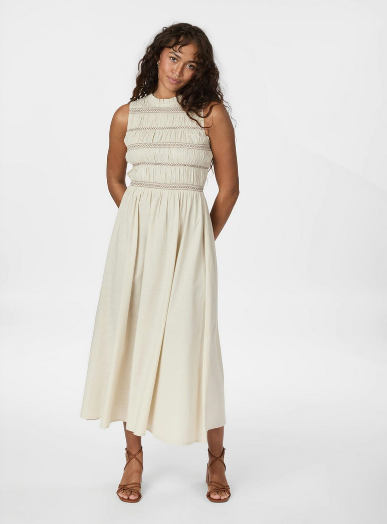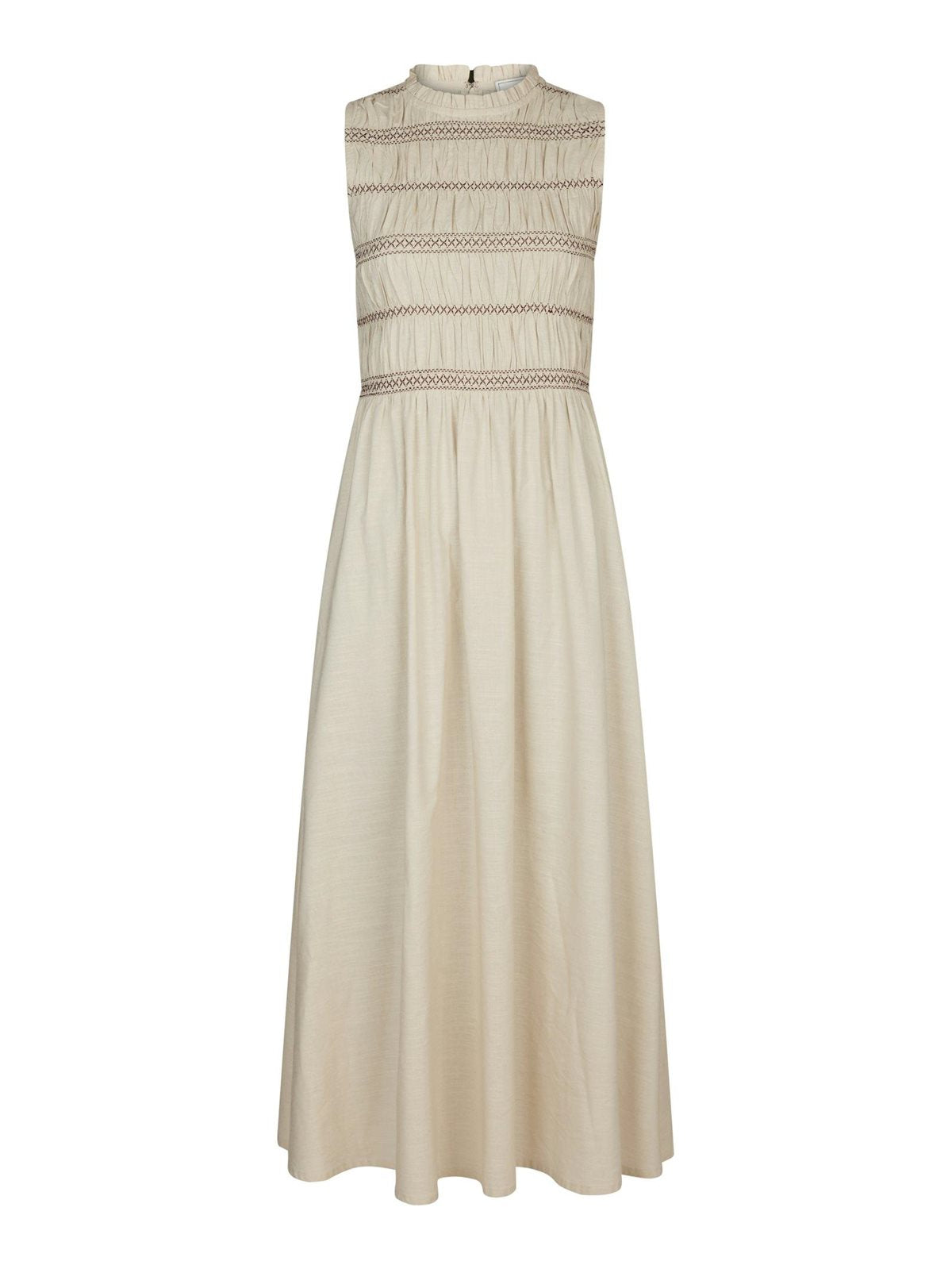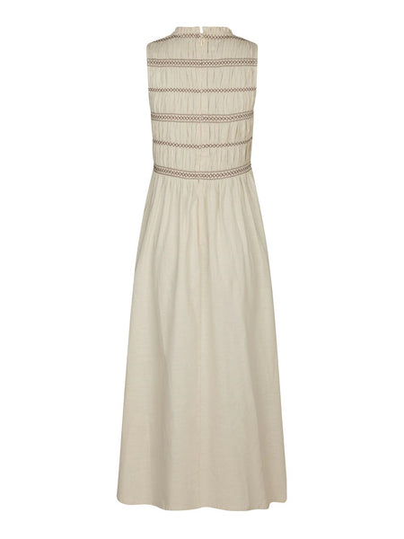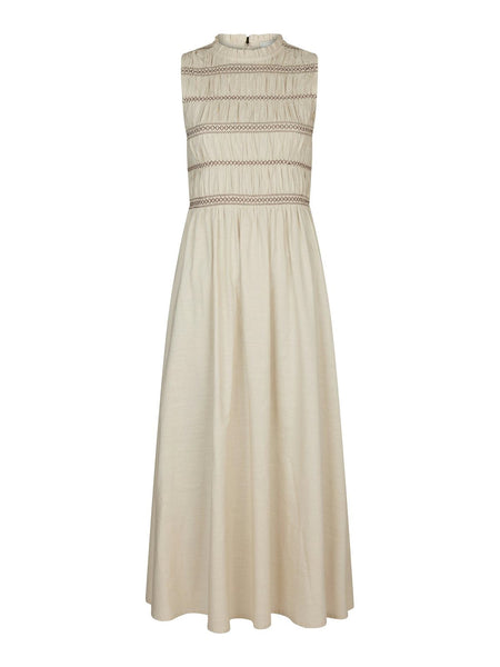 Atika kjolen fra Neo Noir er en midi kjole med smockdetaljer. Kjolen har en rund halsudskæring med en lille flæsekrave, er ærmeløs og lukkes med en skjult lynlås bagpå. Den har dekorative syninger og et fyldigt skørt. Kjolen er lavet i bomuld og har en almindelig pasform.