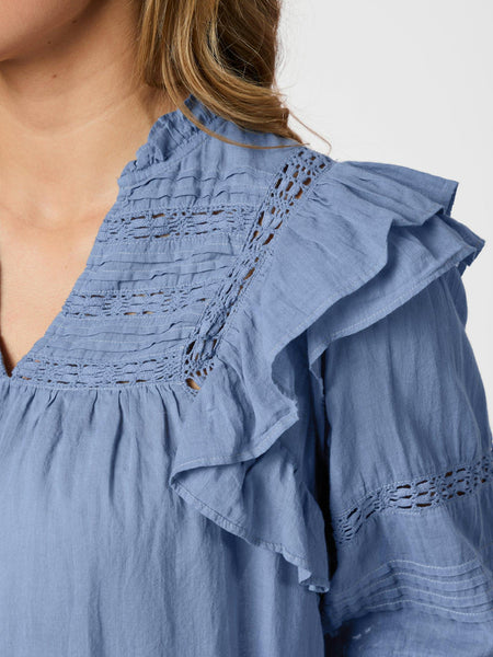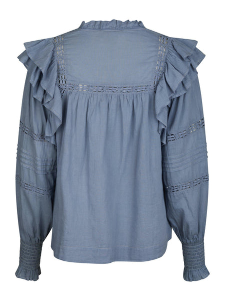 Mauri blusen fra Neo Noir er en feminin skjorte i fin bomulds voile kvalitet. Den har v-hals, flæse detaljer og blondebånd samt vidde i ærmerne. Blusen har lange ærmer med elastik, og en lille v-hals.