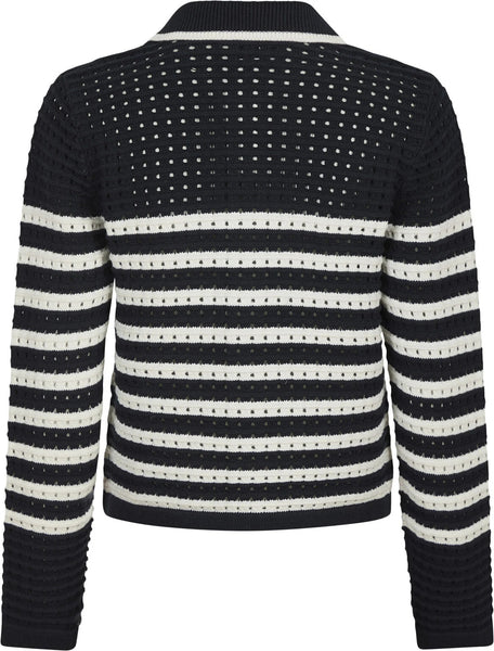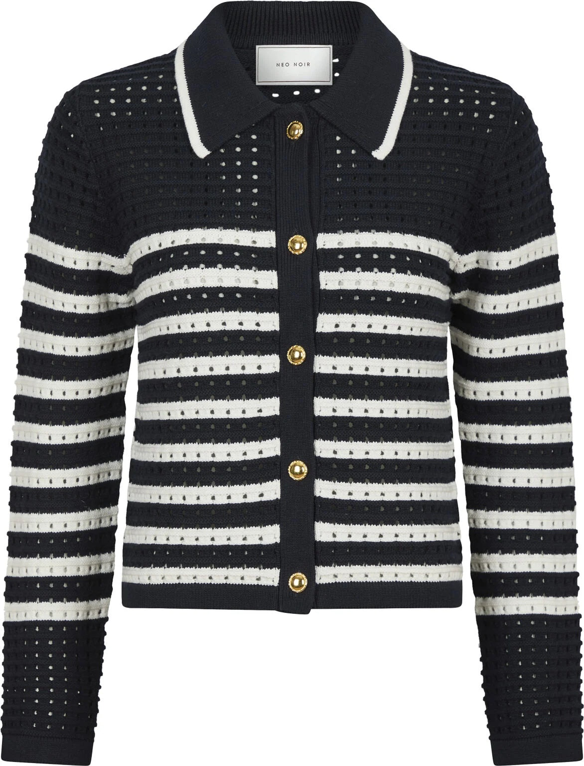 Effie knit cardiganen fra Neo Noir er en strikket cardigan med striber og krave. Cardiganen har guld knapper ned foran og er lavet med et let hullet mønster.