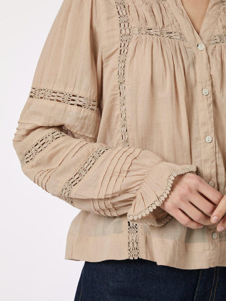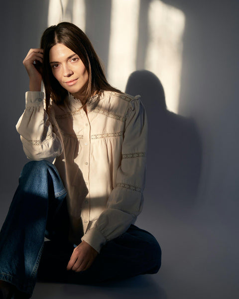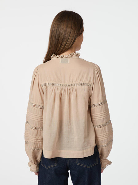 Lyla blusen fra Neo Noir er en feminin skjorte i fin bomulds voile kvalitet. Den har v-hals, flæse detaljer og blonde bånd samt vidde i ærmerne. Blusen har lange ærmer med elastik, og en lille v-hals.