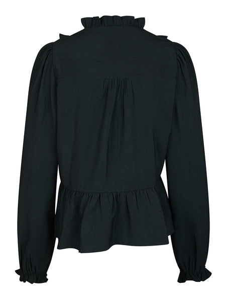 Melfy blusen fra Neo Noir er en bluse med fine flæse detaljer og lange løse ballon ærmer med en flæsekant ved håndleddet. Blusen har skjult knaplukning ned over brystet og klædelig peplum fra taljen.