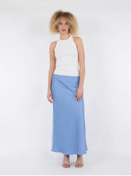 Den lange nederdel med elastik indvending i taljen er skåret på skrå og falder smukt med let svaj forneden. Kvaliteten er en lækker blød satin.