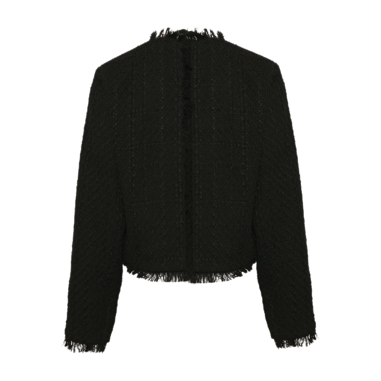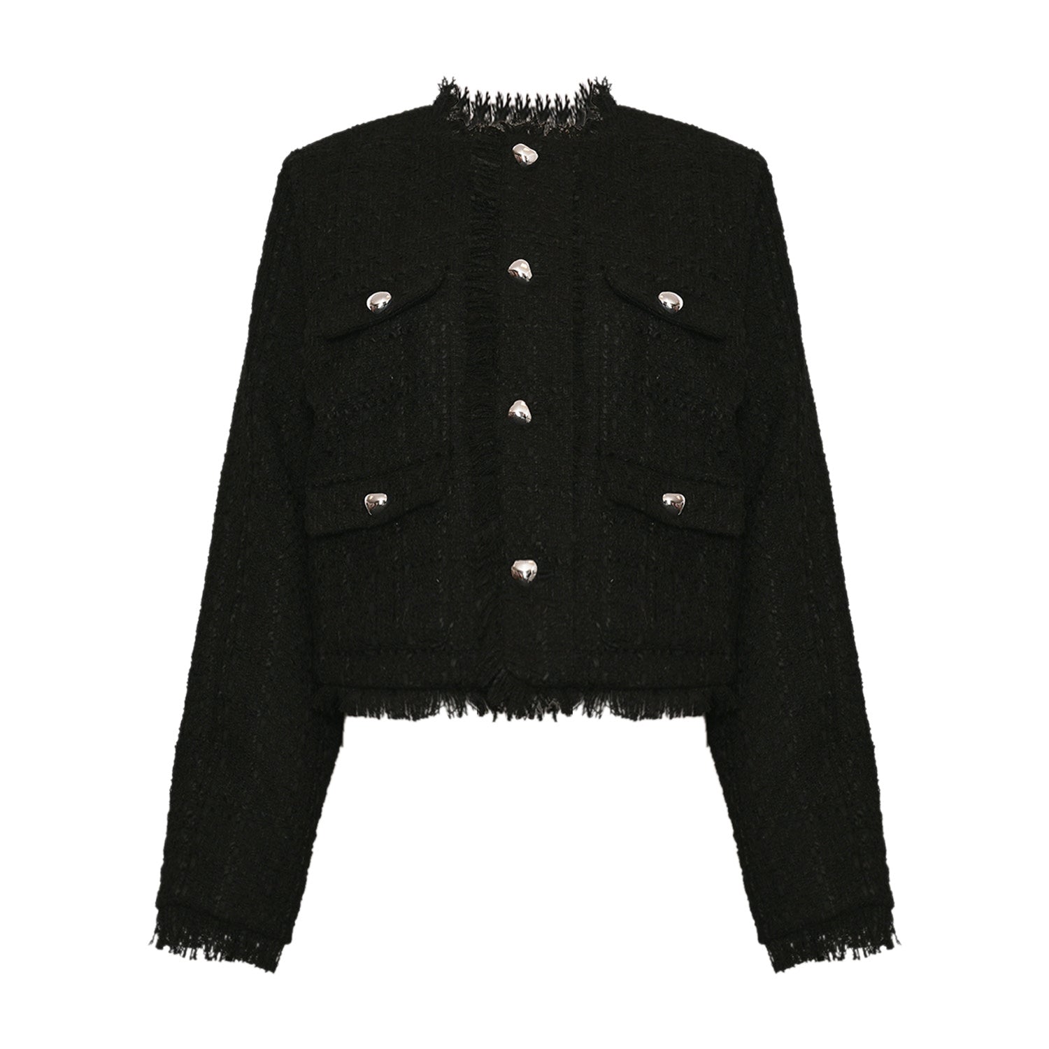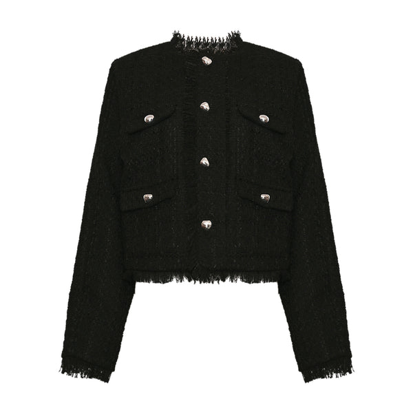 Kallie fra Noella er en flot kort jakke i tweed med fire små lommer og hjerteformede knapper. Den har rund hals uden krave og knappes ned foran. Og så har den frynser i ærmekanterne og forneden.