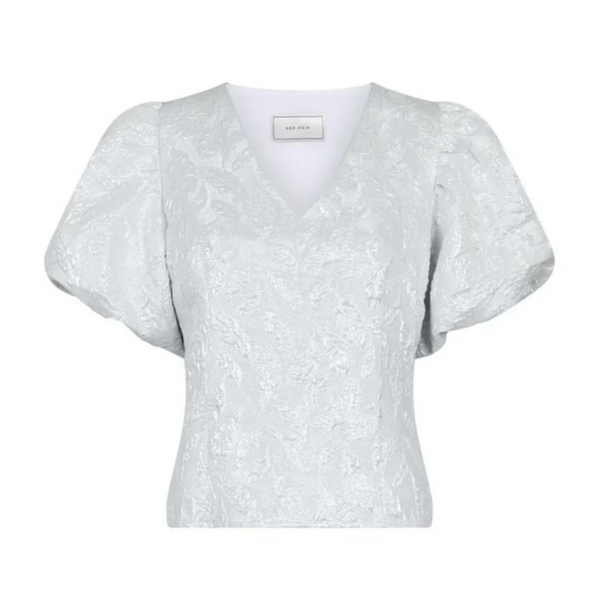 Camia blusen fra Neo Noir kommer her i en smuk og festlig sølvmetallic. Blusen har korte voluminøse ærmer og v-hals.
